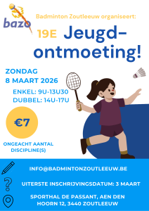 Binnenkort vinden onze ontmoetingen plaats voor senioren (dinsdag 4 maart) en jeugd (zondag 16 maart, zie affiche). De seniorenontmoeting kent een denderend succes en is volgeboekt. Voor de jeugdontmoeting zijn er nog plaatsen vrij. Wacht niet te lang om in te schrijven voor enkel en best ook voor dubbel, want tijdens de middag is de sporthal moeilijk te bereiken door de carnavalsstoet.